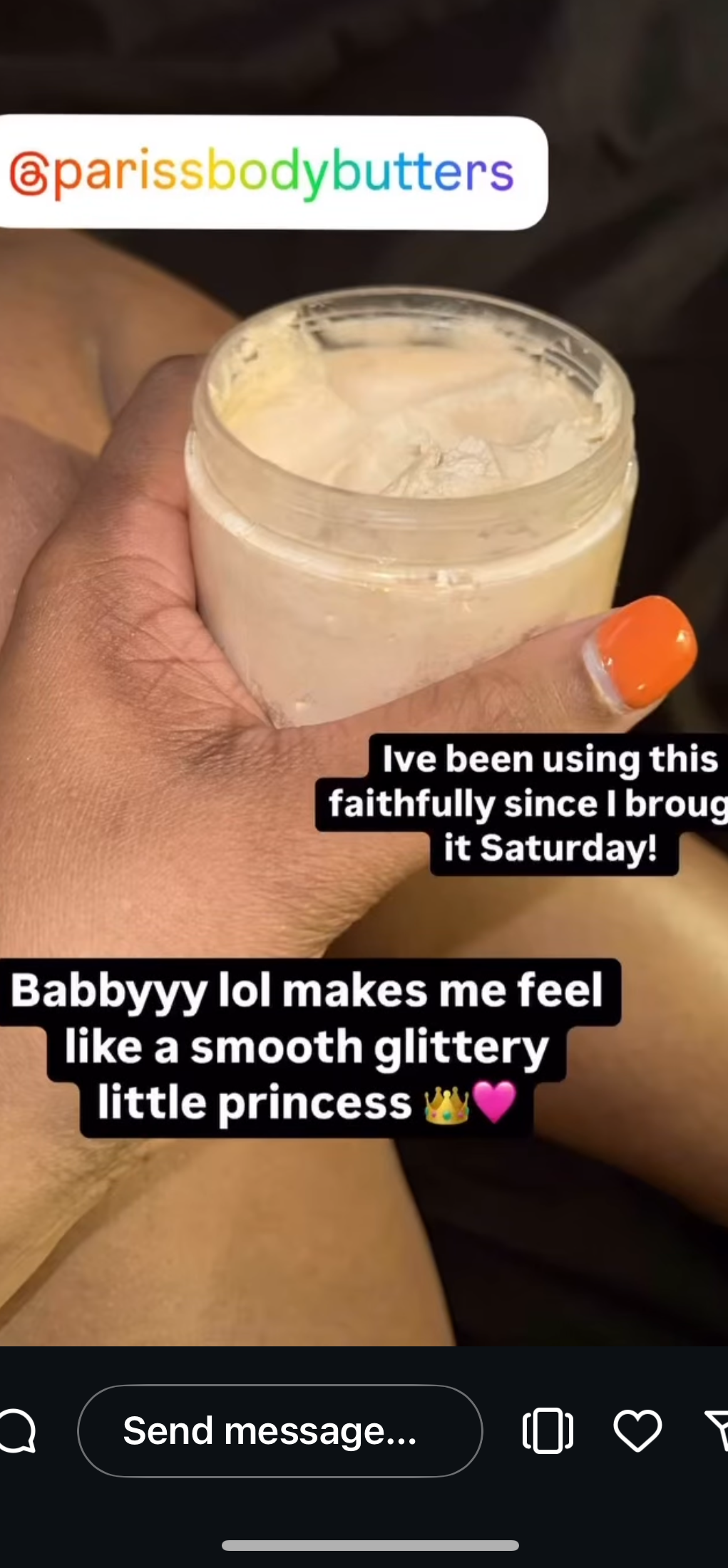 Shimmer Body Butter is a luxurious whipped blend designed to nourish, soften, and enhance your skin’s natural glow. This creamy, lightweight formula melts effortlessly on contact, delivering deep hydration while leaving behind a subtle shimmer for a luminous finish. Perfect for daily use or special moments when you want your skin to look soft, smooth, and radiant. The shimmer adds a delicate, eye-catching glow that enhances any skin tone.